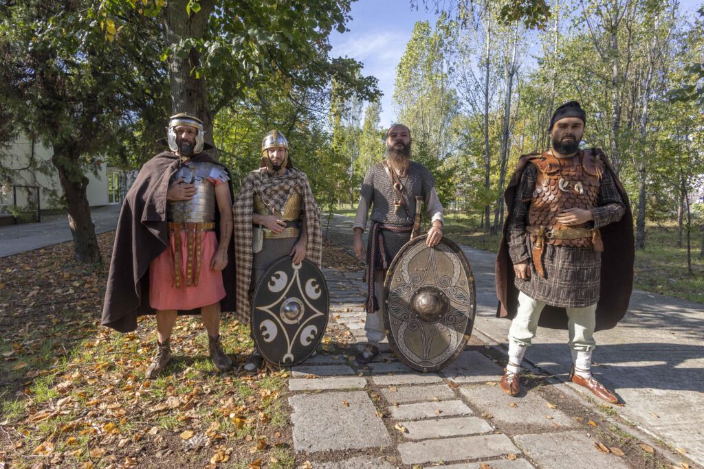 „Scutul ăsta, pe care-l vedeți aici, apare la baza Columnei lui Traian. Exact la dimensiunea asta, cu modelul acesta”, le-a explicat unul dintre bărbați, costumat în dac. „Am trei coifuri dacice și unul roman, toate reconstituite din săpături arheologice”, a adăugat romanul. Copiii au fost încurajați să probeze coifurile și să ridice scuturile, iar reacțiile lor au fost pline de entuziasm și curiozitate.